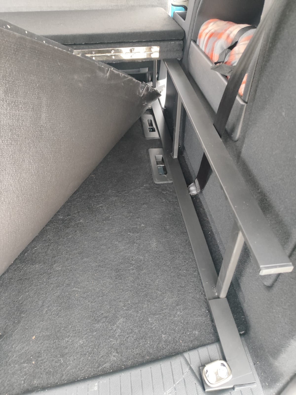 El colchón se apoya parcialmente sobre la estructura y parcialmente sobre los asientos abatidos de la fila central, quedando todo a la misma altura. El resultado: una cama estable y nivelada de 118 x 190 cm, ideal para dos personas.